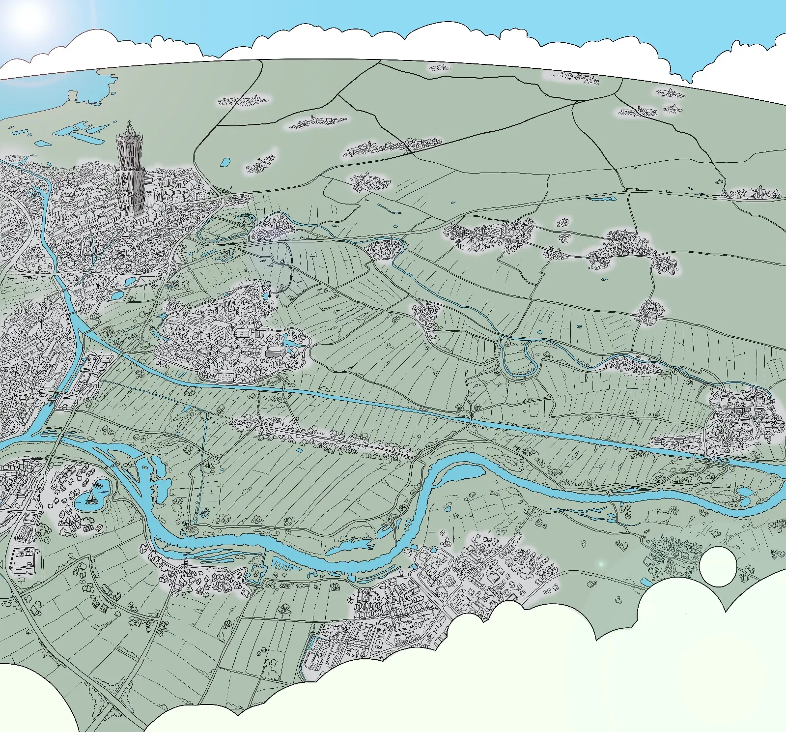 Ik besloot de kaart niet simpelweg van bovenaf te tekenen, maar er een lichte bolling in te verwerken voor een dynamisch perspectief. De basis van de wegen trok ik over van Google Maps, terwijl ik de satellietbeelden op een tweede scherm gebruikte om details stukje bij beetje in te vullen. Perfecte nauwkeurigheid was niet het doel; het ging erom dat je duidelijk kon zien waar steden, bossen en boerenland liggen. De wegen zijn echter vrij accuraat weergegeven.